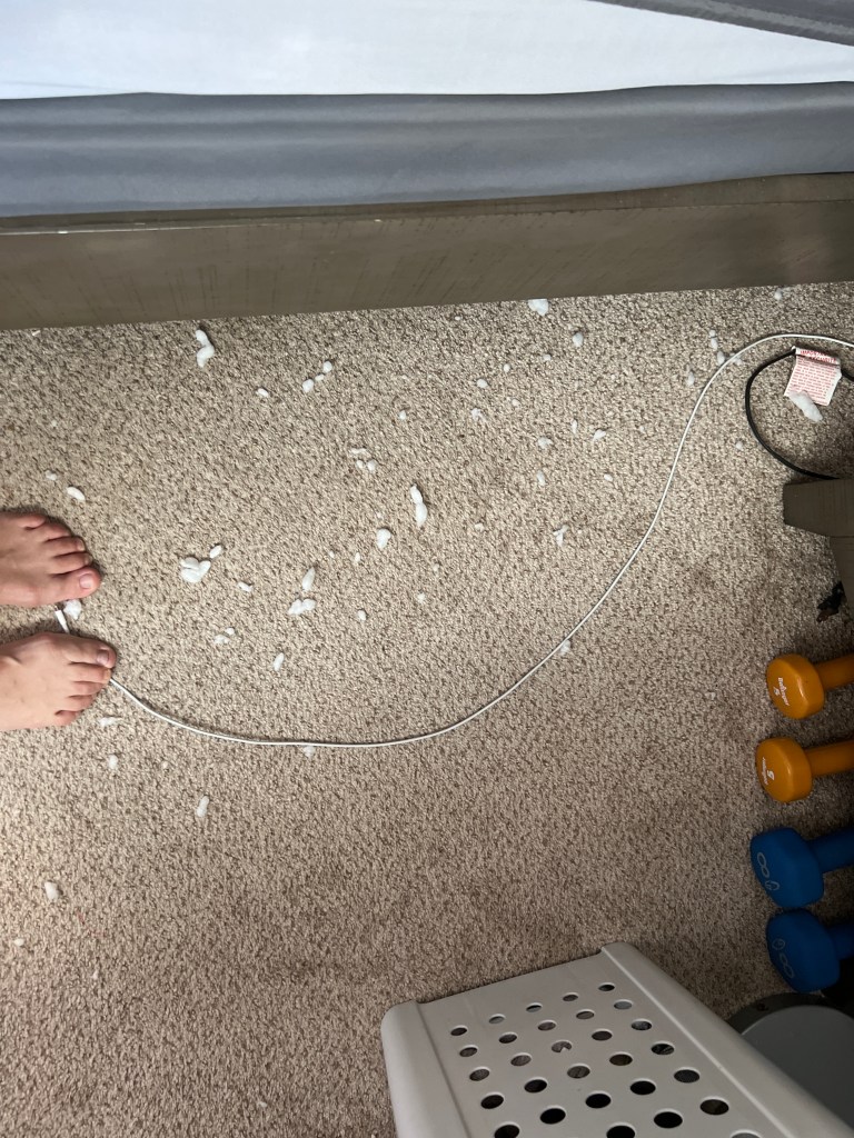 Over the past couple of months, I noticed a change in him. As noted in the pictures above, our relationship… I mean, his body … started to unravel. He’s lost his sense of being. Literally, I wake up with a handful of cotton balls stuck to my hair or butt. My carpet is carpeted with the remnants of what used to be, even though my husband attempted to sew up his open wounds.